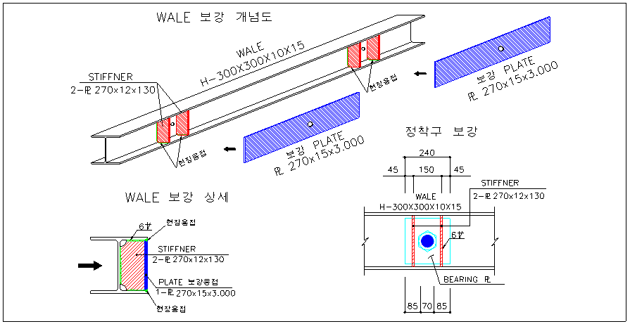 띠장(H-BEAM)을 90°로 회전시켜 약축방향으로 설치하면 강성이 1/3정도로 저하되므로 띠장의 구조적 안전성 확보 여부를 다음과 같이 검토하였다.