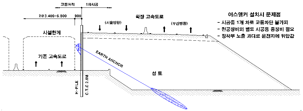 교통 운용중인 기존 차로측의 정착부 돌출 폭을 최소화하기 위하여 띠장(H-BEAM) 1단을 약축방향으로 설치하고 법면측에서 인장관리토록 변경함.
