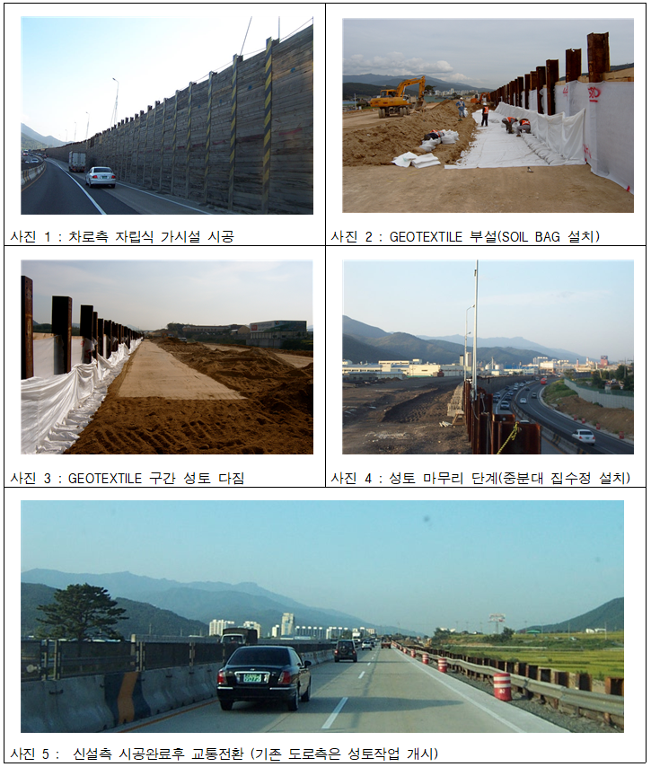 자립식 가시설 설치→기존도로면에서 1.0m 일반성토 → GOETEXTILE MAT 부설 → 전면측에 SOIL BEG 설치 → MAT 50cm씩 층말기 및 성토다짐 → 포장층 하단까지 반복 → 포장층 시공 완료 → 신설측 교통전환