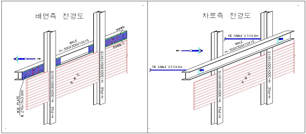 - 기존도로측 가시설의 띠장 및 정착부 노출을 최소화 하기 위해 H-BEAM을 약축방향으로 1열 설치하고 법면측에서 인장 관리.
