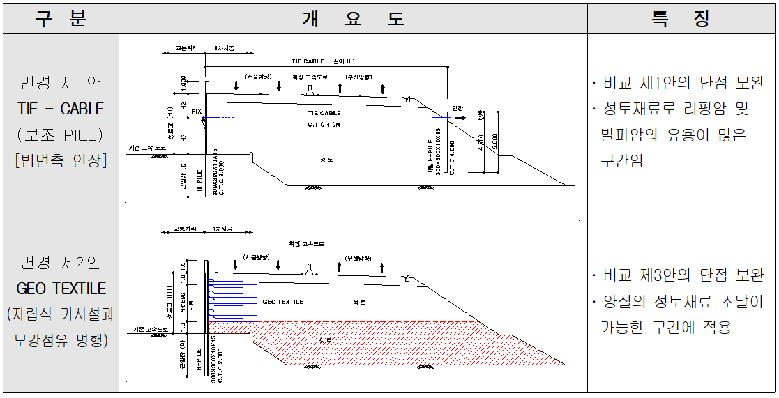 ☞ 상기 비교안을 검토한 후 각 구간별 여건에 맞게 대안공법(변경1,2)을 각각 선정하였다.