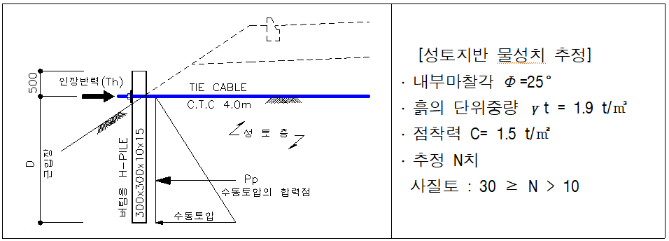 ◎ TIE CABLE의 인장력(Th) : 28.740 tonf (성토 단계별 인장력 검토내용 참조)