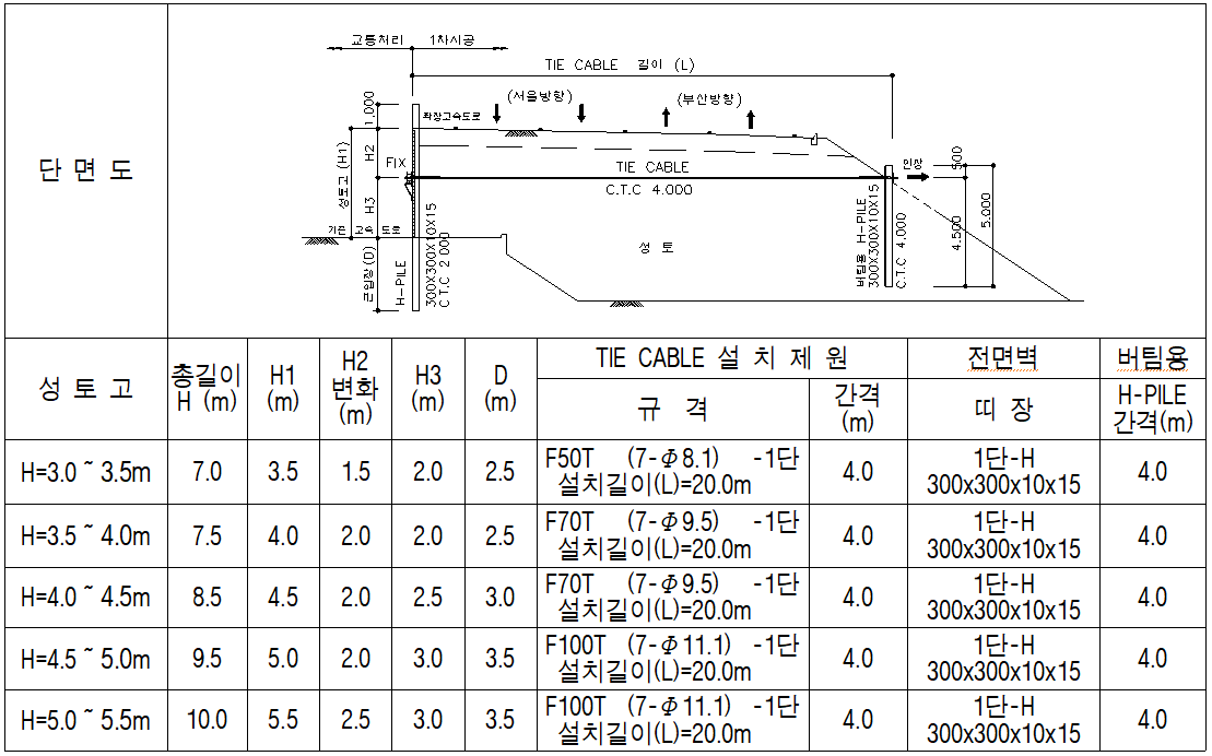 | 성토고 | Tie Cable규격 | Tie Cable 허용하중(tonf) |