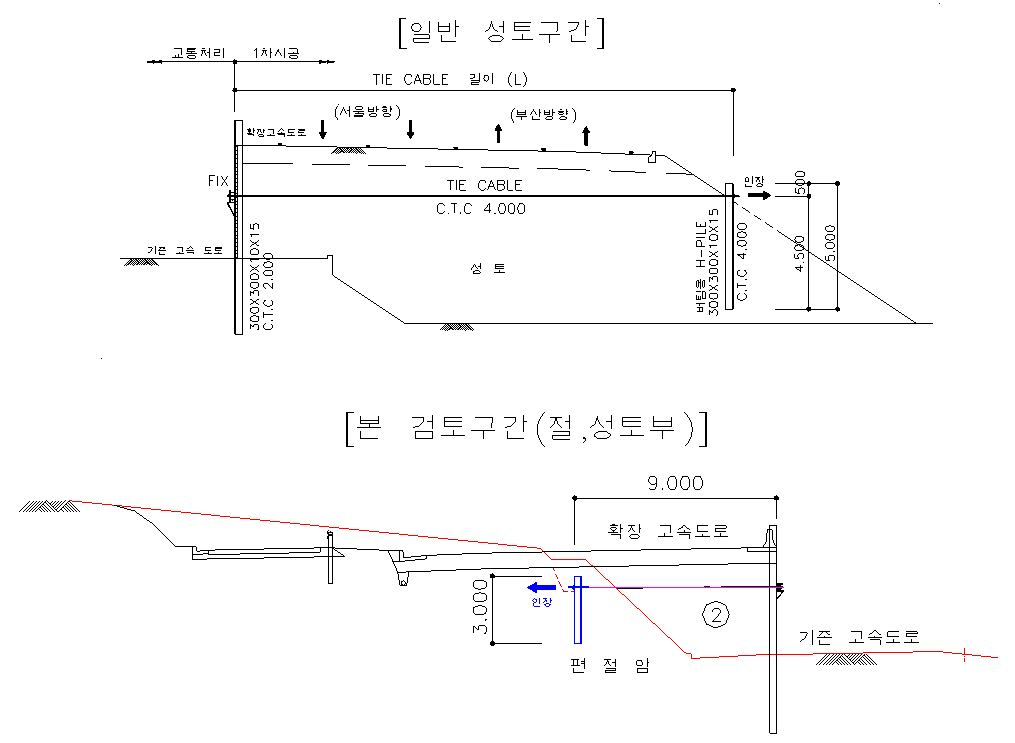 일반 성토구간은 법면측에 버팀용 H-PILE을 설치하여 TIE CABLE을 인장하나, 본 검토구간은 버팀PILE의 설치 위치가 암 절토부에 위치하게 되어 별도 검토가 요구된다.